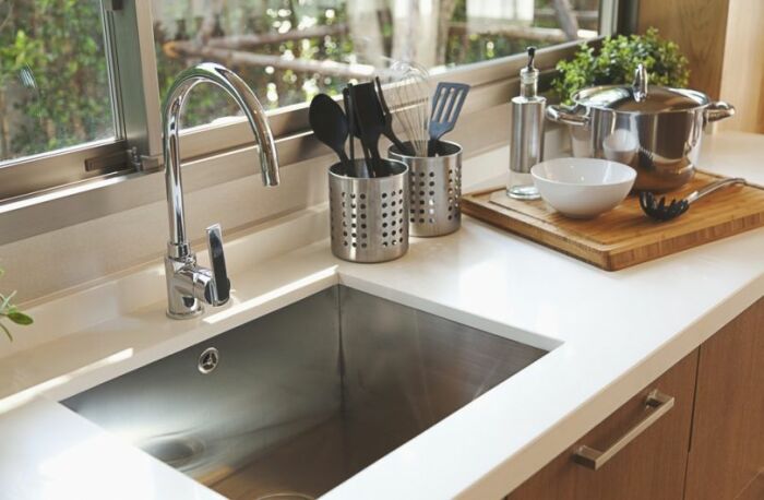 Современные тренды сделали очень популярными мойки из искусственного камня. Однако на практике это решение не особо хорошее. Чтобы не покупать дорогую мойку, зачастую выбор останавливается на мойке из акрилового камня, а он очень быстро царапается и повреждается, теряя свой привлекательный вид. Обеспечить себе долговечную и красивую мойку можно выбрав плотный нержавеющий материал. Лучше всего, если мойка будет подклеена снизу столешницы, а не сверху. Так у нее не будет бортиков и всю воду, загрязнения или другие элементы со столешницы можно беспрепятственно смахивать прямо в раковину — это очень удобно.
