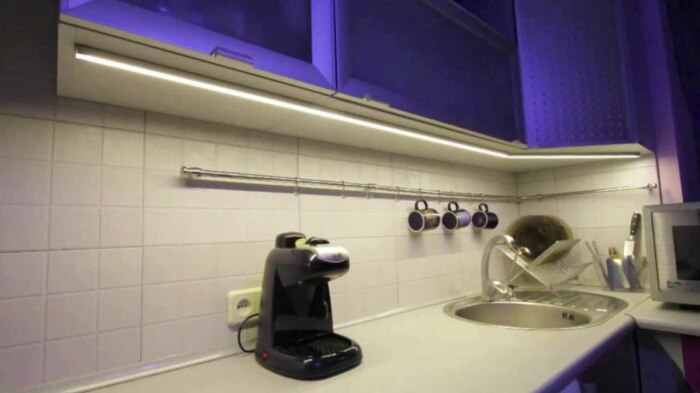 Чаще всего светодиодную полосу подсветки на кухне размещают на нижней части верхних ящиков. Однако не всегда это выполняется правильно. Чтобы обеспечить хорошую видимость для готовки, следует размещать подсветку в центре нижней части шкафов или на том крае, который дальше от стены. Однако современные строители и продавцы кухонных стенок упорно продолжают предлагать варианты, в которых подсветка располагается прямо под стеной.