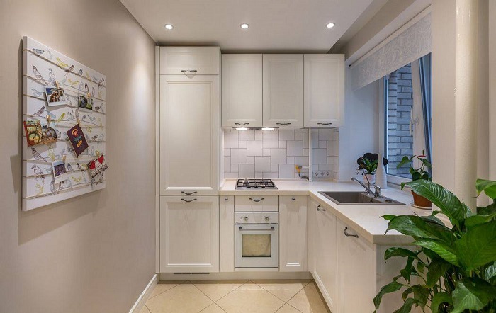 Если для вашей кухни не подходят гарнитуры с типовым шагом секций, спроектируйте узкие шкафы, которые идеально впишутся в имеющееся пространство. Но в этом случае учитывайте, что вам нужно будет где-то разместить бытовую технику, ведь ассортимент узких приборов намного меньше стандартного, и не факт, что получится встроить ее в шкафы. Поэтому если вы решили сэкономить место на кухне за счет ширины мебели, для начала подберите подходящую технику.