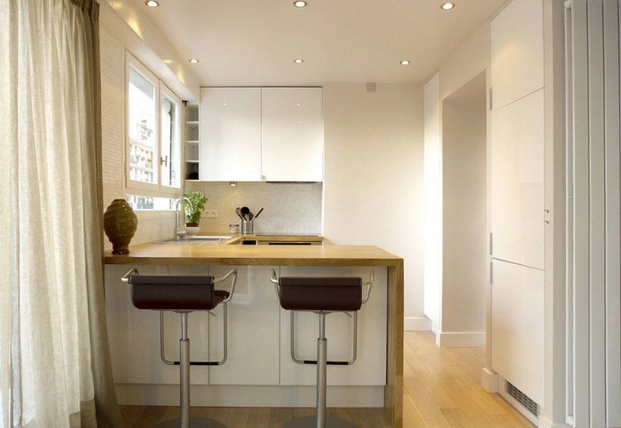 Даже при большом желании на маленькой кухне не получится расположить полноценный обеденный стол на пять персон. А даже если и получится, то в комнате не останется места для маневров. Самым оптимальным вариантом будет установить компактную барную стойку. Она не занимает много места, является достаточно функциональной, но при этом имеет существенный минус – может вместить до двух человек, поэтому большим семьям такой вариант вряд ли подойдет.
