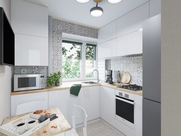 При оформлении крохотной кухни важно не только правильно подобрать цвет стен, но также обращать пристальное внимание на оттенок и фактуру пола. Тяжелые и грубые узоры, например, дробная плитка с активными швами или материалы с ярко выраженной текстурой древесины не подходят для вашего интерьера, так как они визуально уменьшают пространство. Обратите внимание, что покрытие нужно укладывать так, чтобы визуально скорректировать некоторые зоны, а точнее, зрительно расширить узкие проходы. В этом вам поможет ламинат, положенный длинной стороной поперек, а не вдоль помещения. Выбирайте не матовый пол, а полуглянцевый. Несмотря на то, что первый намного проще в уходе, второй имеет способность отражать свет и делать комнату просторнее. А еще можете организовать подсветку на уровне плинтуса, чтобы добавить кухне «воздуха».