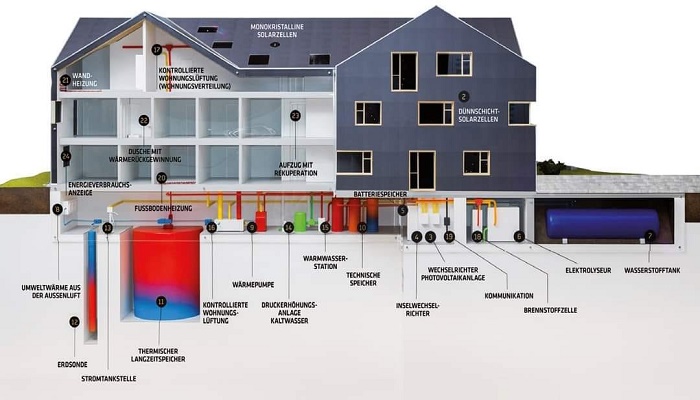 Пилотный проект был запущен еще 10 лет назад, когда построили два многоквартирных дома в разных городах Финляндии. Первый дом-электростанция под названием Луукку (Luukku) находится в центре страны, на берегу озера Каллавеси, в Куопио. Это студенческое общежитие с 47 полноценными квартирами, в котором созданы все блага цивилизации. Помимо жилого пространства в доме обустроены две сауны (паровая и инфракрасная), общие зоны отдыха для социального взаимодействия молодых людей, бассейн с подогревом воды и тренажерный зал. Но необычным все-таки является то, что в доме внедрена инновационная система автономного жизнеобеспечения. Производство собственной энергии происходит за счет фотоэлектрического эффекта (солнечные панели), а для поддержания комфортной температуры в помещениях в холодную пору используется геотермальная система отопления.
