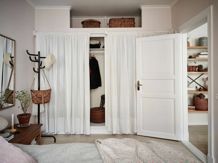 Еще одна небольшая гардеробная, расположенная в нише и прикрытая шторами. /Фото: i.pinimg.com