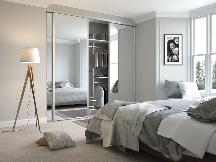Чтобы не скрадывать свободное пространство и не делать комнату намного меньше, гардеробную можно разместить в небольшой нише, которую потом закрыть сплошными зеркалами. С помощью такого простого, но действенного приема очень удобно делить пространство, которое визуально даже становится больше, а не меньше. Главное чтобы двери гардеробной были полностью представлены зеркалами без рисунков и дополнений, а их обрамление не сильно контрастировало с оформлением стены.
