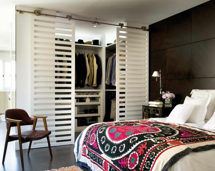 В качестве загородки для гардеробной, расположенной в нише, может выступать даже раздвижная дверь с неполными вставками дерева. Полупрозрачная загородка не позволяет рассмотреть содержимое гардеробной, но в то же время делает пространство более свободным и открытым.