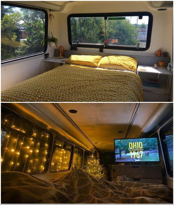 Спальная зона в доме-автобусе, созданном британскими влюбленными.