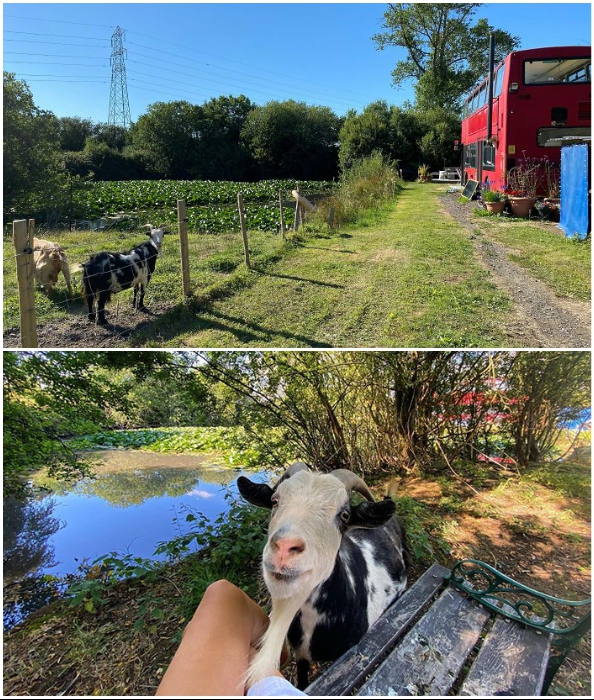 Учитывая, что у ребят имеется постоянное место для парковки, они облагородили и прилегающую территорию. Рядом с автобусом сделали деревянный помост, на котором установлена садовая мебель, легко превращающаяся в удобные диванчики, стоит лишь уложить несколько подушек. Там же имеется большой стол на все случаи жизни и этажерка для мелочей. Влюбленные оказались довольно хозяйственными молодыми людьми, они завели парочку коз – Монти и Дарвина, которые свободно разгуливают по участку. Для них они соорудили загон и небольшой сарай, так что теперь все имеют крышу над головой с минимальными финансовыми затратами.