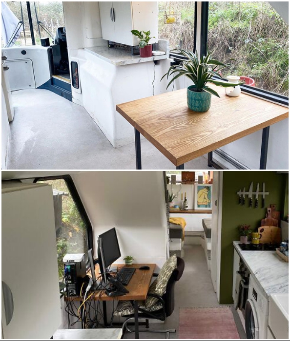 Чтобы разграничить пространство кухни и гостиной, Чарли и Люк предусмотрели шкаф для мелочей и инструментов с одной стороны, а с другой – кладовую. Сама же кухня получилась довольно просторной и полностью укомплектованной. Помимо мебельного гарнитура были установлены газовая плита, духовой шкаф, мойка, холодильник, стиральная машина и вся необходимая бытовая техника, упрощающая процесс приготовления пищи. Рядом нашлось место и для обеденной зоны, и для организации домашнего офиса.