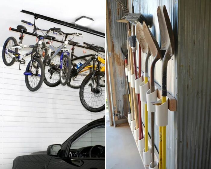 Стойки упорядочивают хранение негабаритных вещей. Велосипед неудобно хранить просто поставленным к стене – он неустойчив и падает. Поэтому лучше подумать о специальной стойке, особенно, если «двухколесных коней» несколько. Версий таких конструкций много: велосипед можно зафиксировать на полу, на стене, или же подвесить на потолочные крюки. Еще один вариант стоек, которые пригодятся в гараже – конструкции для хранения грабель, лопат и прочего негабаритного инвентаря с длинными ручками. Сделать их несложно самостоятельно, например, из поддонов или остатков ПВХ-труб.
