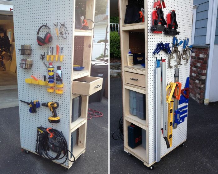Тележка-стеллаж – отличное решение для много работающего мастера. Если гараж достаточно большой или инструменты часто используются для работы во дворе, стоит подумать о тележке. Открытая конструкция на колесиках станет замечательным помощником мастера. Она довольно узкая и не занимает много места, но достаточно широкая, чтобы вместить наиболее часто используемые инструменты. При этом тележка мобильна – ее всегда можно перекатить в нужное место.