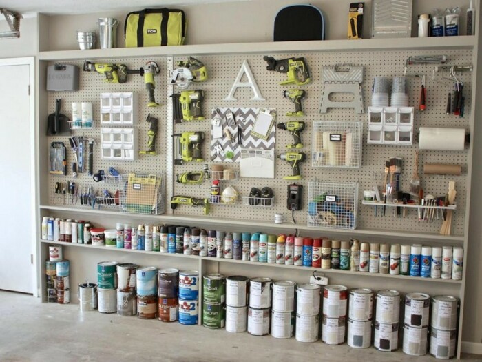 Один из лучших способов организации хранения мелких и средних инструментов – это перфорированная панель. Крючки и держатели легко перемещаются, позволяя постоянно реконфигурировать доску, оптимально используя каждый квадратный сантиметр. При этом инструменты находятся на виду, в легкой доступности. А чтобы не путаться, на какой крючок возвращать предмет, можно обвести его контуры на перфпанели карандашом.