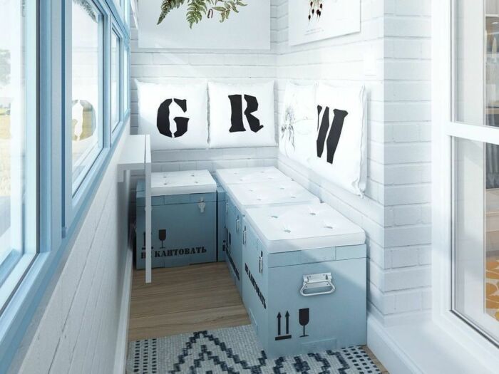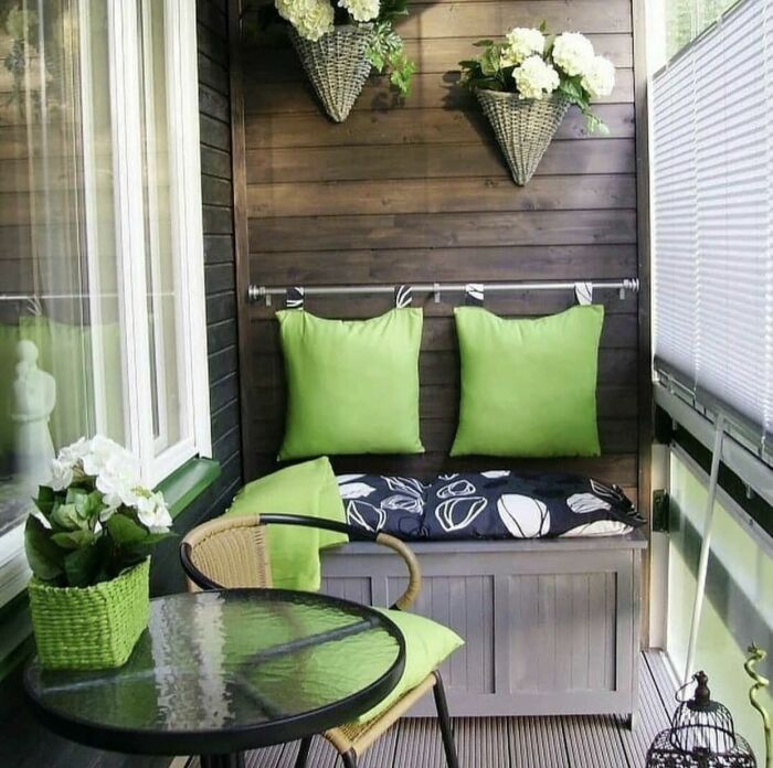 Вместо того чтобы забивать балкон шкафчиками и многочисленными коробками с вещами, можно оборудовать его таким образом, что там будет приятно отдыхать и хватит места для разумного хранения. Для этого можно поставить пуфы или диванчик с внутренними зонами хранения. Они будут скрыты, но при этом не займут все пространство и будут выглядеть аккуратно, красиво и изящно.