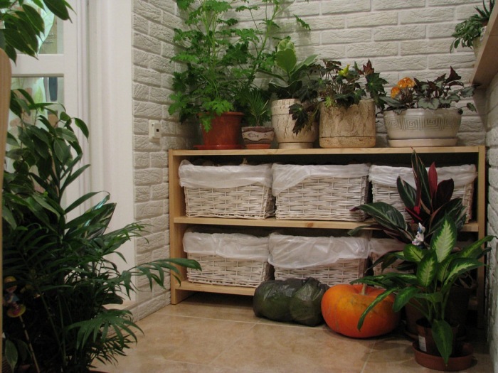 Балкон — идеальная зона для выращивания зеленых друзей. Это могут быть обыкновенные декоративные цветы, а также плодородные культуры, например, огурцы, помидоры, капуста, брокколи и многое другое. Для высадки можно использовать горшки или более габаритные ящики, в которых помещаются целые грядки. Дополнительно такую зеленую зону можно обеспечить плетеными корзинами и ящиками, где будет храниться урожай и другие продукты или нужные вещи.