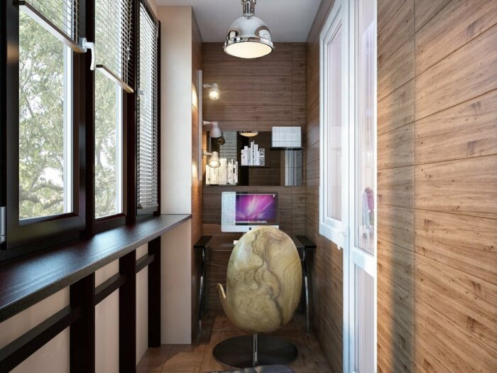 Комфортное и уединенное рабочее место — залог высокой продуктивности. Именно такой уголок вполне реально организовать на балконе, где точно никто не помешает. Для этого нужно позаботиться о простом, но уютном ремонте, небольшом столе и комфортном стуле. Дополнительно можно сделать открытые полочки или закрытый шкаф для хранения документов и другой канцелярии.