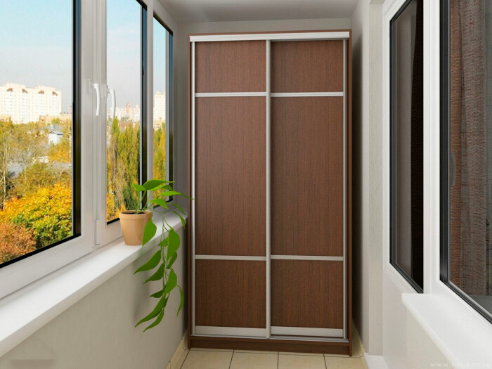 На балконе вполне можно разместить небольшую гардеробную, которая станет дополнением к спальне. Для этого достаточно поставить шкаф-купе и расчистить остальное пространство для примерок одежды.