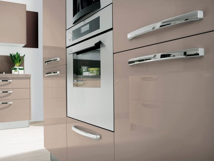 Если вы увидите фурнитуру, сделанную из глянцевой нержавеющей стали, то моментально влюбитесь в нее, ведь роскошный блеск ручек так и притягивает взгляд. Однако ваше мнение резко изменится, как только вы начнете активно пользоваться кухней. Дело в том, что на металлических глянцевых поверхностях очень быстро оседает грязь. Стоит лишь один раз открыть дверцу шкафчика мокрой рукой, как на ручке сразу образуются некрасивые пятна и разводы. И это лишь верхушка айсберга. Представьте, как вам придется оттирать следы жира с фурнитуры микроволновки! В целом, процедура не из приятных. Чтобы существенно облегчить себе жизнь и ускорить уборку, выбирайте матовую фурнитуру. Она намного практичнее, а по внешнему виду ничуть не хуже глянцевой.