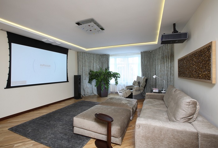 Возвращение ретро вещей в моду – это новый тренд. В интерьерах квартир все чаще можно заметить виниловые проигрыватели, фотоаппараты мгновенной печати и прочие предметы из далекого прошлого. Не остались в стороне и проекторы, которые сейчас покупают вместо телевизоров. Дизайнеры уверяют, что при просмотре фильмов на таком «ТВ», вы испытываете совсем другие ощущения – обстановка становится более камерной, уютной и атмосферной. Мы советуем не заморачиваться и обойтись обычным плазменным телевизором необходимого вам размера. Дело в том, что для использования проектора нужен специальный экран или хотя бы светлая стена. Следующий момент связан с тем, что при свете дня вы его смотреть не сможете, поэтому нужно сразу обзавестись плотными шторами. Также обязательно понадобятся отдельные динамики, чтобы обеспечить хороший звук. Если не считать всех этих заморочек, от проектора отпугнет дорогое содержание и обслуживание.