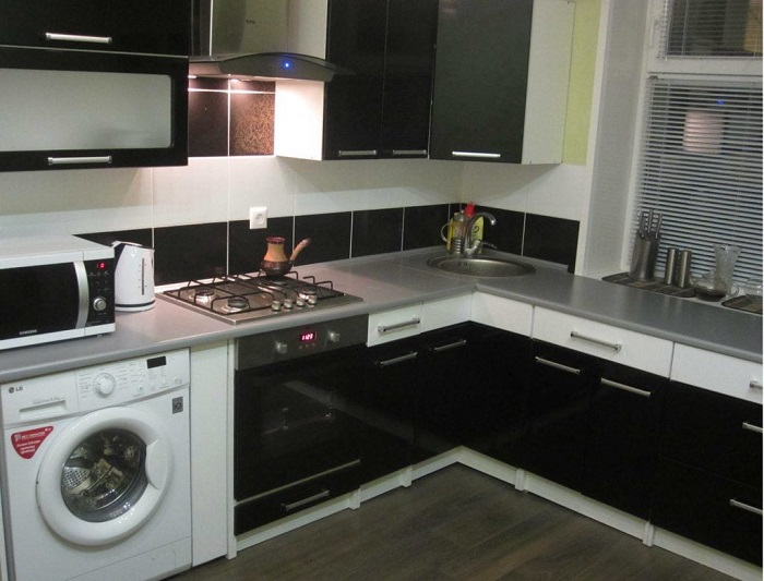 Полностью черная кухня бесспорно выглядит эффектно и дорого. Однако если говорить о ее практичности, то сразу возникает очень много нюансов, особенно, если вы выбрали глянцевый гарнитур. Так, на мебели ежедневно будут появляться разводы от жесткой воды, отпечатки пальцев, капли жира, которые видны невооруженным глазом. И если на светлых фасадах подобные загрязнения малозаметны, то на темных все с точность до наоборот. Как результат – ежедневная длительная уборка и жизнь с тряпкой в руках.