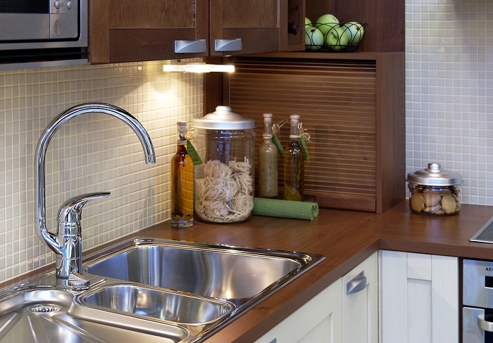 На маленьких кухнях очень сложно расположить большую чашу раковины из-за недостатка места. Как дизайнеры выходят из этой ситуации? Они стараются компенсировать крохотный размер высоким изливом крана. У такого решения есть, как плюсы, так и минусы. С одной стороны, всегда можно помыть большую кастрюлю или банку, но с другой – вода разбрызгивается по всей кухне, попадая на плиту, столешницу, полки, шкафчики. Если такое будет повторяться изо дня в день, гарнитур и столешница испортятся, особенно если они сделаны из недорогого материала. Поэтому не стоит бросаться из крайности в крайность – выбирайте мойку оптимальной глубины и кран умеренной высоты.