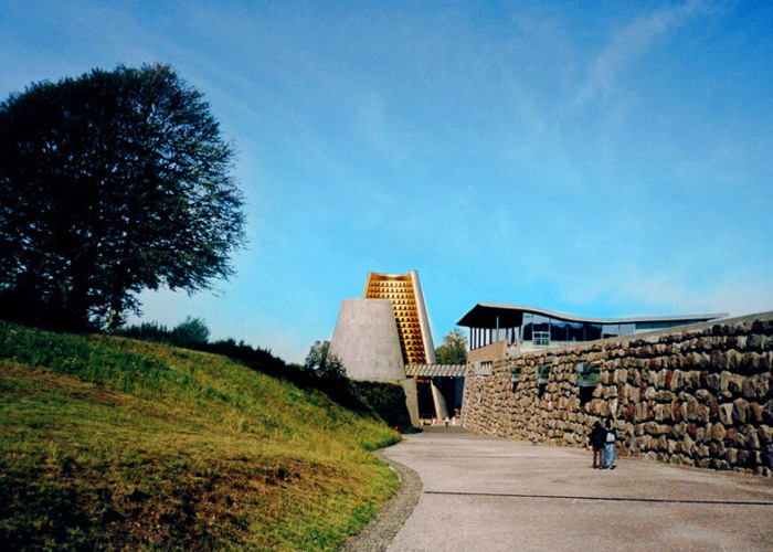Изогнутая форма вулкана расколота, чтобы показать огненно-золотой интерьер и подземные уровни комплекса (Vulcania Centre, Франция). Не один год этот футуристический проект с его потусторонним, перевернуто-золотым кристаллическим конусом, образно говорящем о геологии, космических кораблях и ракетах, пирамидах и месте для психоделических переживаний вызывал очень много горячих споров и бурю недовольства. Но несмотря на все сложности, объект был завершен и теперь по праву считается «подставкой для книг постмодернистского движения».