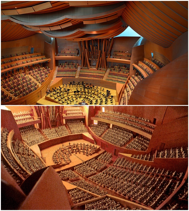 Интерьер концертного зала Уолта Диснея в Лос-Анджелесе под стать фантастическим формам экстерьера.