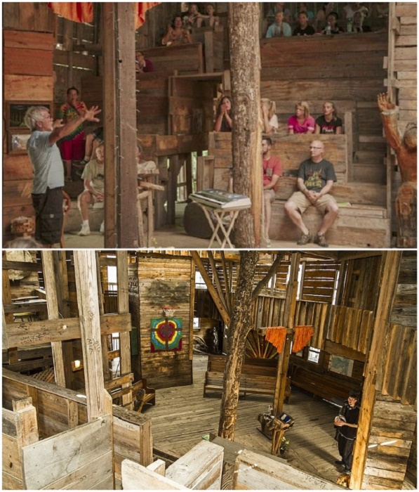 Интересный факт от Novate.ru: На первоначальном плане создания традиционного домика на дереве Гораций Берджесс не остановился, во время строительства он так увлекся, что решил задействовать не только самый большой дуб, но и рядом стоящие деревья. В итоге у него получился настоящий небоскреб на дереве, высота которого достигает 30 м (10-этажный дом!), а площадь 900 кв. м. А самое удивительное, что он потратил на его создание всего лишь 12 тыс. дол. В общей сложности, если не считать огромное количество переходов, террас, балконов и площадок в гигантском «домике» на дереве, энтузиаст обустроил 80 полноценных комнат. Среди стандартных жилых пространств в доме имеется собственная церковь с иконостасом и большим залом для молитв, который легко превращается в баскетбольную площадку. Также он создал колокольню и несколько тайных убежищ, куда закрыт путь для любопытных туристов и паломников. А их в этом доме всегда предостаточно.