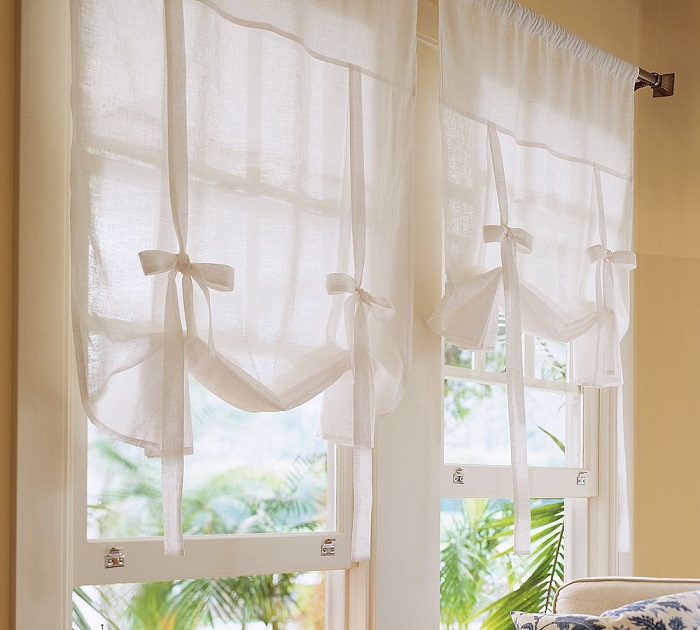 Это простой и стильный вариант оформления окна, который зачастую используют для маскировки некрасивого пейзажа. По своим размерам полотна китайских штор четко соответствуют проему окна. В верхней части текстиля находятся подвязки, предназначенные для его регулировки. К сожалению, подъемный механизм в таких моделях не предусмотрен, поэтому приходится поднимать их вручную. Некоторые хозяйки предпочитают избегать подобных неудобств, а потому часто фиксируют шторы в одном положении. Впрочем, поднять их можно на любую высоту при помощи ленты из контрастного материала, пришитой сверху к полотну ткани с наружной и изнаночной стороны. Вы даже можете обойтись без карниза, что очень радует.