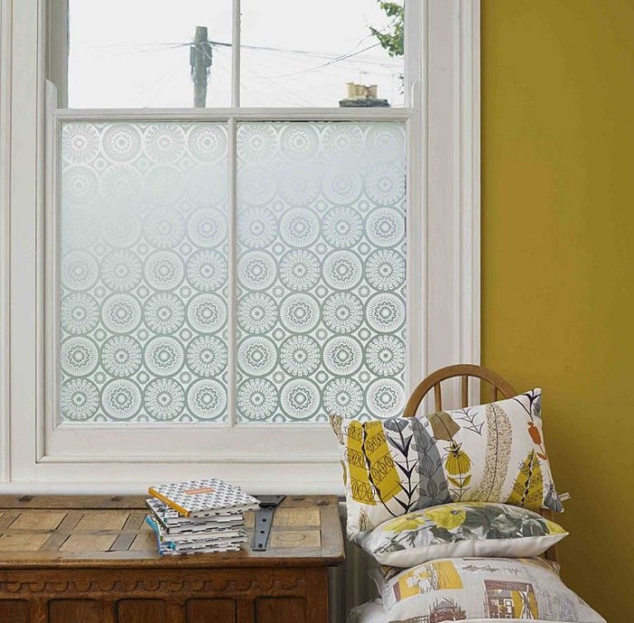 Заменить тюль на окне можно специальной пленкой. Зачастую ее используют жители первого этажа, которые хотят отгородиться от назойливого внимания со стороны прохожих. Ее можно наклеить как на все окно, так и на одну его часть, либо верхнюю, либо нижнюю.