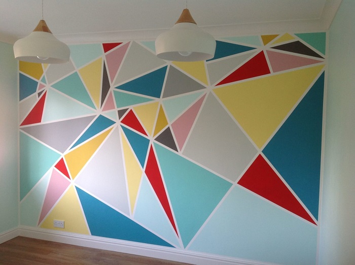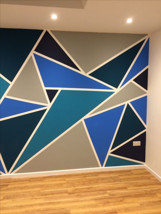 Для создания геометрических фигур вам понадобится краска двух оттенков, валик и малярный скотч. Вначале покрасьте стену в тот цвет, который будет использован в качестве узора. Далее сделайте шаблон при помощи скотча и окрасьте поверхность другой краской в несколько слоев. Последний шаг – снимите малярную ленту и наслаждайтесь интересным принтом.