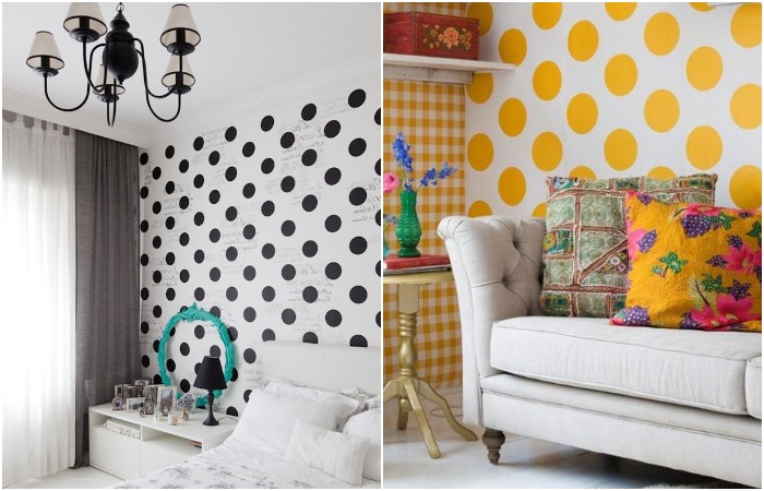 Этот принт всегда актуален. В дизайне интерьеров используется мелкий, средний, крупный горох, но самым востребованным и популярным все-таки остается последний. Очень часто родители выбирают его для оформления детской, но также горох смотрится гармонично в спальнях и коридорах. Последовательность действий при создании рисунка очень простая и понятная. Для начала следует вырезать из губки круг, затем окунуть его в краску желаемого цвета и «отпечатать» горох на стене. Классикой будет черный принт на белом фоне, но мы советуем все-таки отталкиваться от стиля интерьера и его цветовой гаммы. Если квартира оформлена в скандинавском стиле и в помещении преобладает, например, белый цвет с зелеными акцентами, логично будет рисовать зеленый горох, чтобы он гармонично вписался в имеющееся пространство.