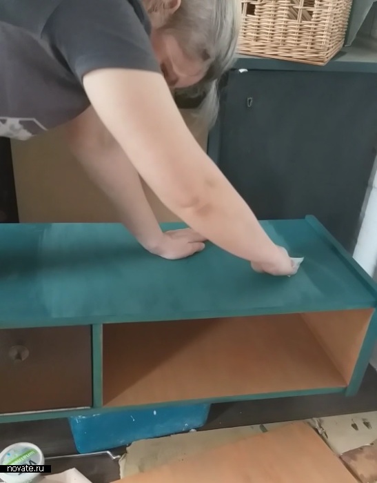 Этот этап - не обязательный. Но на случай, если интересно, опишем и его. В набор входят два вида готовой меловой краски и воск. По инструкции нужно нанести один цвет, дать высохнуть, затем воск и второй цвет. После высыхания пройтись наждачкой, создавая эффект состаривания. Был нанесен воск и краска из набора цвета молочного шоколада. Осталось лишь пройтись наждачкой.