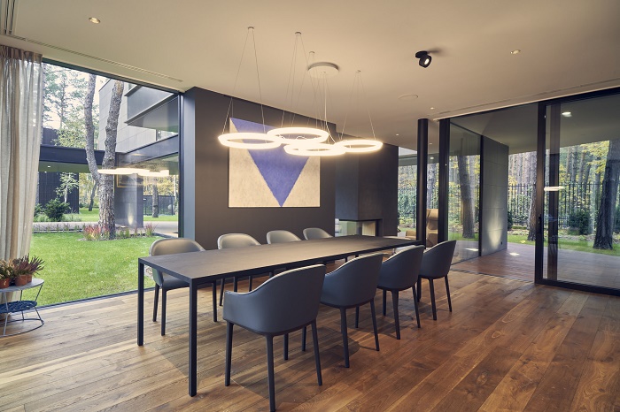 Несмотря на то, что дом со стороны лицевого фасада выглядит довольно внушительным, да и площадь он занимает немаленькую – 400 кв. м, само жилое пространство обустроено на меньшей его части. Мало того, что не весь объект имеет два этажа, так еще и значительную площадь отвели под создание внутреннего двора, ставшим продолжением леса. По задумке автора проекта, значительная часть строения практически открыта, при этом внутренний двор плавно выходит за пределы резиденции, сливаясь с природным ландшафтом. Несмотря на такую открытость, о приватной жизни владельца, являющегося коллекционером, тоже позаботились. Его участок окружен забором, поэтому по территорию домовладения праздношатающиеся зеваки попасть не смогут.