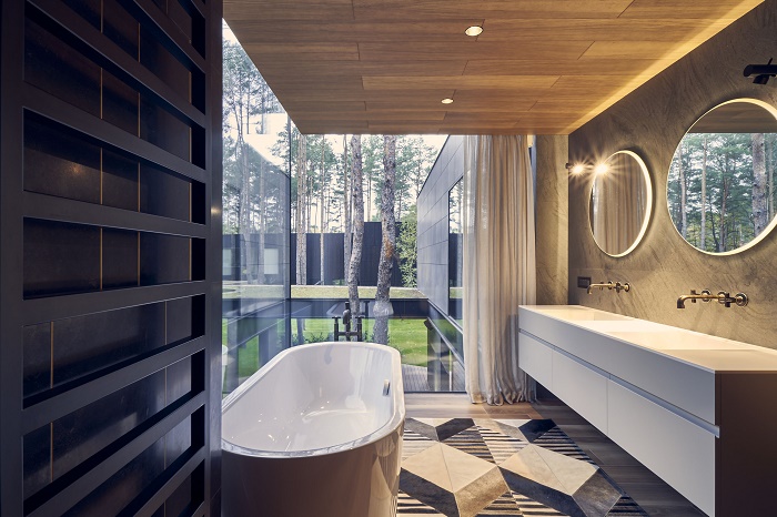Спа-зона расположена у панорамного окна первого этажа (Circle Wood, Польша). | Фото: baoxaydung.com.vn. «Дом отличается сдержанностью к деталям, что подчеркивает элегантность материалов и его простоту. Непосредственный контакт с природой означает, что дом меняется в зависимости от окружающей среды – погоды, времени суток и года», – говорит автор проекта об основной идее резиденции. Строительство загородных резиденций в природной зоне требует особенно тщательной планировки и щадящего строительства для обеспечения максимального сохранения окружающей экосистемы. В Германии, например, один дом в лесу был построен так, что ни одна сосна не пострадала.