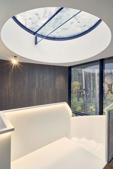 Конструктивные особенности: Загородная резиденция Circle Wood создана из железобетона, но чтобы строение органично интегрировать в природный ландшафт, его покрыли панелями из древесины красного дерева окуме, привезенного из Западной Африки. Отличительной особенностью экзотической древесины считается ее структура без сучков и благородный вид. Матовые стеклянные панели, заменяющие часть стен, являются прекрасным материалом, позволяющим стереть границы между внешним и внутренним пространством, усиливая ощущения полного слияния с природой. А мансардное окно-атриум, расположенное в центре дома, обеспечивает естественным светом все внутреннее пространство и расширяет обзор, позволяя любоваться еще и звездным небом.