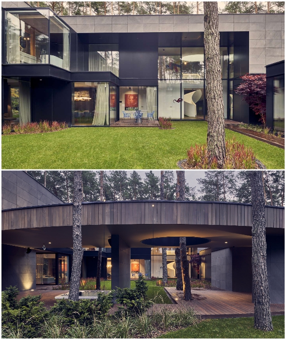 Главным приоритетом во время строительства стала максимальная сохранность деревьев в природной зоне. Именно это послужило причиной того, что внутри дома был создан внутренний двор, в котором остались расти столетние сосны и изящные березы.