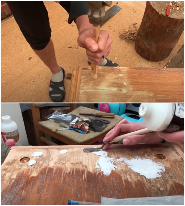 Также нужно было заделать отверстия, в которых крепились ножки от выброшенной столешницы, для этого можно использовать деревянные плашки. Сколы, трещины и неровности на поверхности нужно замаскировать с помощью шпаклевки по дереву. После того, как материал высохнет, нужно еще раз пройтись шлифовальной машиной или мелкозернистым бафом/наждачной бумагой, чтобы сделать наружные плоскости идеально гладкими.