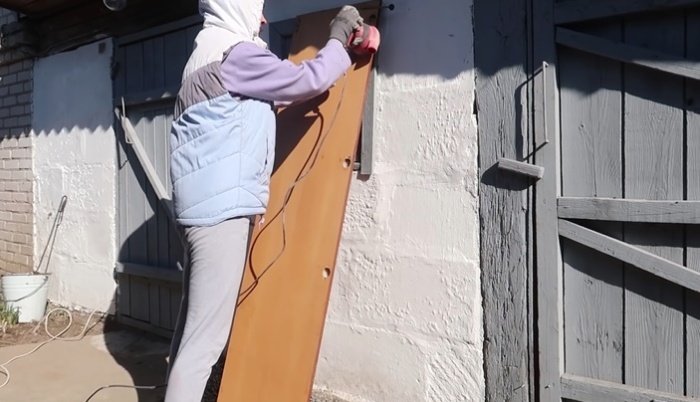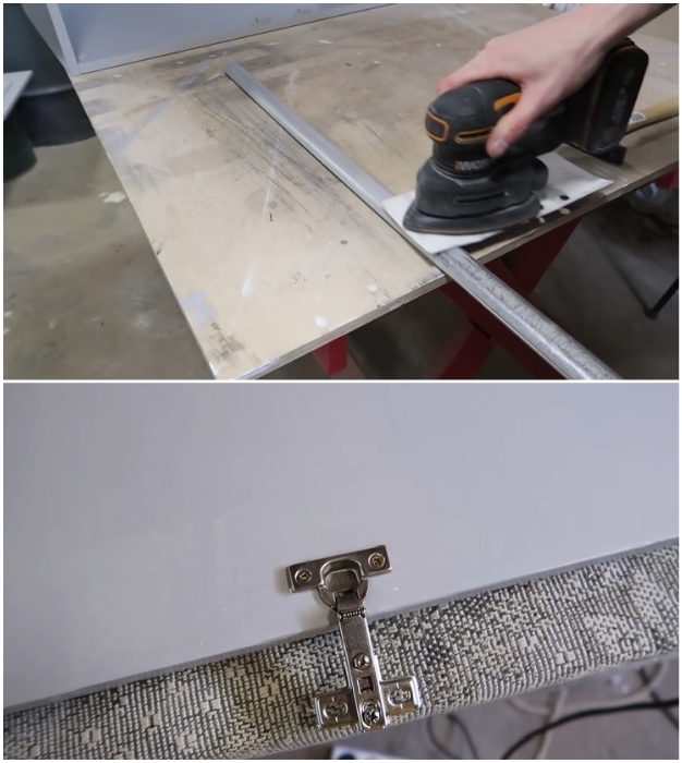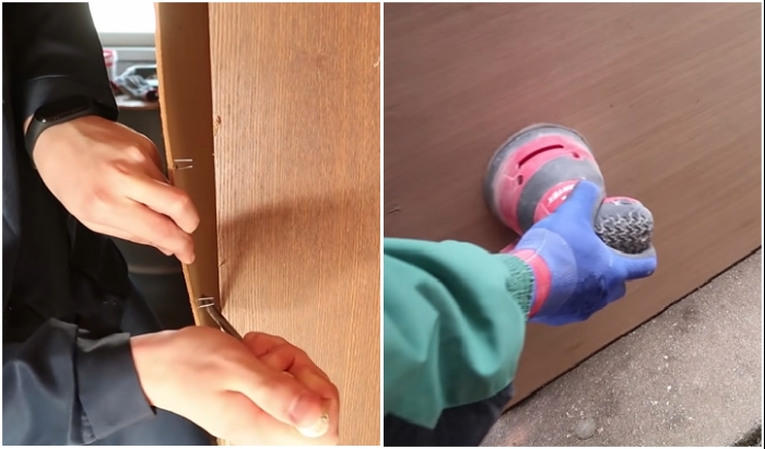 После зачистки поверхностей со всех сторон (не стоит забывать о внутренней части и торцах деталей), их нужно тщательно протереть чуть влажной тряпкой, чтобы полностью избавиться от пыли. Пока дерево просыхает, можно подумать о том, что делать со старыми петлями, которые были уязвимым местом в советской корпусной мебели. Чтобы потом не случилось неожиданностей, Надежда решила их заменить на современные механизмы, поэтому старые углубления требовалось аккуратно замаскировать.