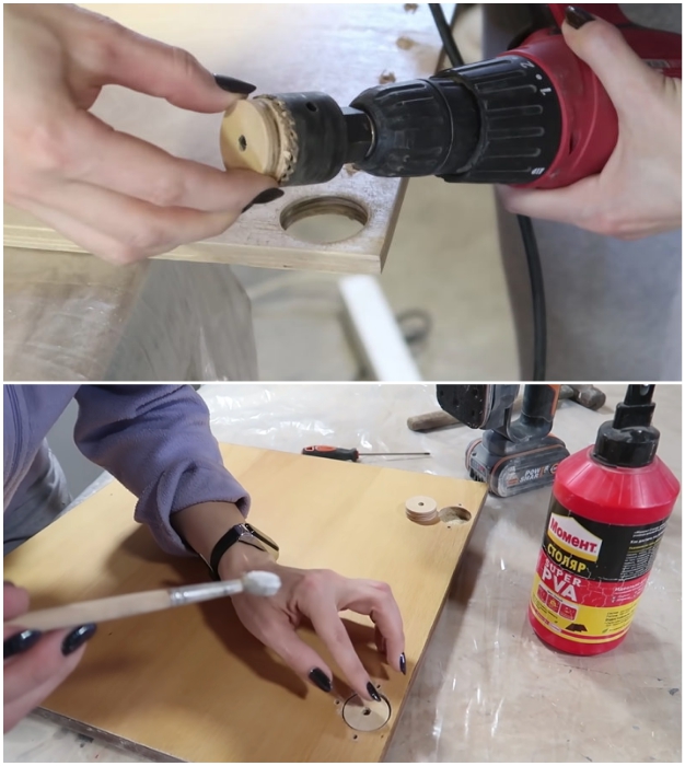 Девушка придумала оригинальный и надежный способ скрыть огромные дыры. Она попросту вырезала круги нужного размера из толстой фанеры, используя электрическую дрель и насадку «коронка», а затем с помощью клея ПВА приклеила их в углублениях. После схватывания материала оставалось лишь избавиться от неровностей и щелей – это можно сделать с помощью шпаклевки по дереву. Когда шпаклевка высохнет, следует зачистить лишнее. Для этого подойдет шлифовальная машинка, наждачная бумага или абразивный баф.