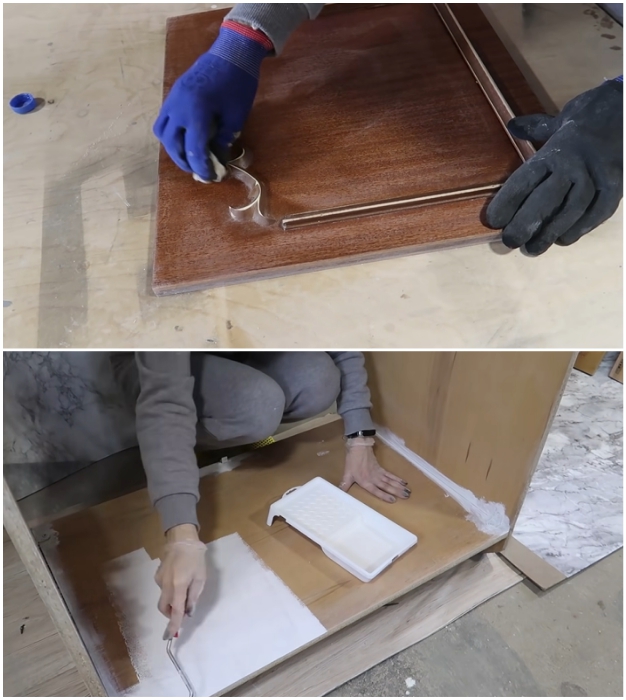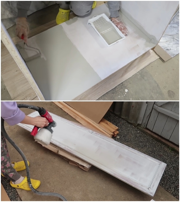 Когда грунтовка хорошо просохнет, можно приступать к окрашиванию. Поскольку интерьер прихожей был в светло-серых тонах, изменять палитру мастерица не стала, чтобы максимально «растворить» громоздкий предмет мебели. Внутренние поверхности и торцевые стороны можно смело красить валиком, а вот фасадную часть, по возможности, лучше вскрывать пульверизатором или краскопультом.