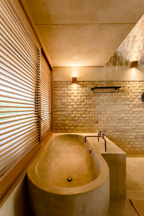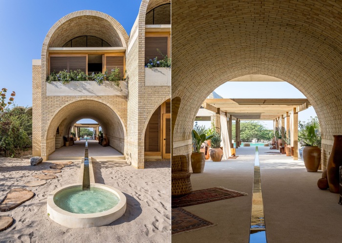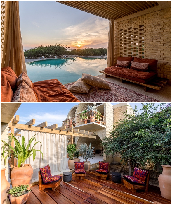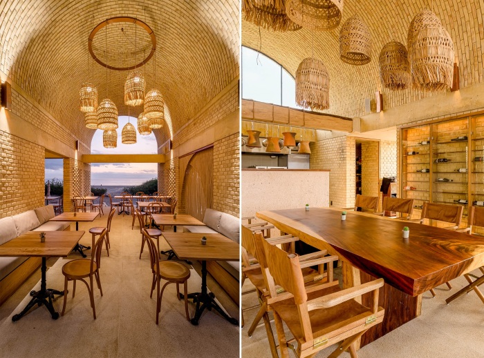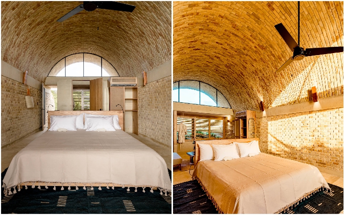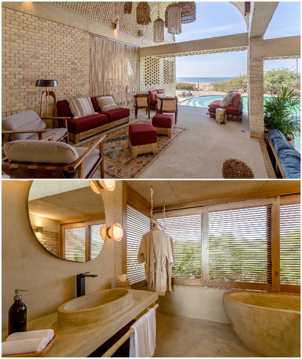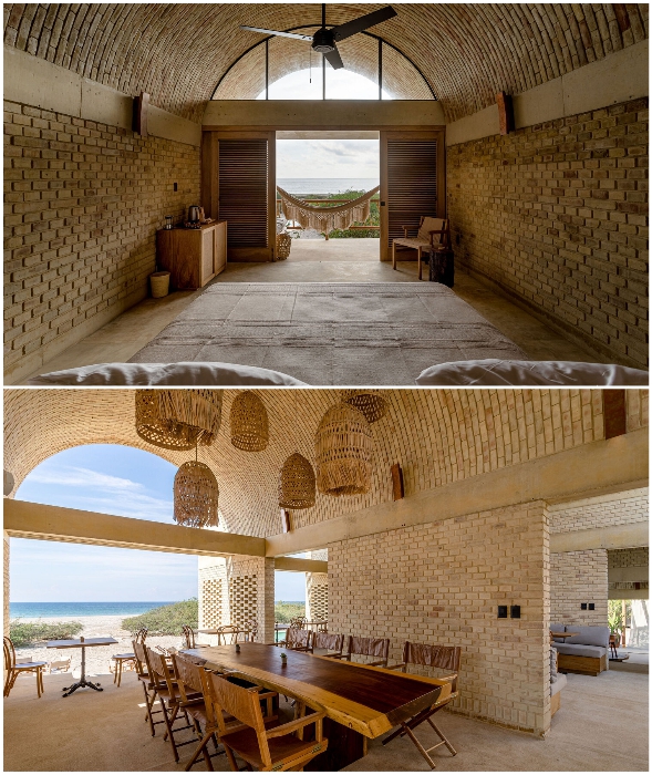 Следуя общей концепции дизайна, кирпич внутри помещений не стали прятать за слоем штукатурки, а утонченно подчеркнули естественную красоту глины и песка элементами декора из дерева, соломы и текстиля из натуральных волокон. Особенно эффектно выглядят арочные двери, больше похожие на ворота, состоящие из деревянных жалюзи, которые обеспечивают приватность, но в приоткрытом положении не мешают движению воздуха и проникновению солнечных лучей.
