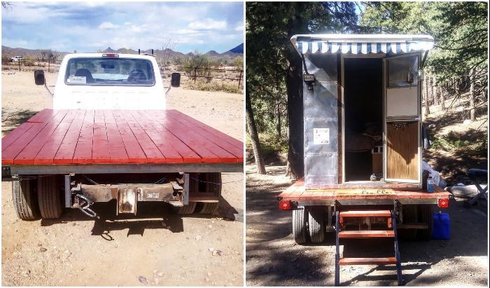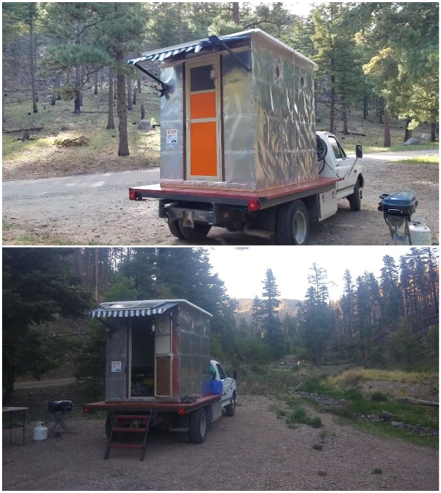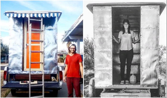Не всегда любители свободной жизни и путешествий обладают достаточными средствами, чтобы приобрести благоустроенные трейлеры или полноценные дома на колесах. Если дорога манит, а средств совсем в обрез, тогда включается фантазия настолько, что удается построить кемпер самостоятельно, пусть и не такой привлекательный как от известных производителей. Так сделала семейная пара из Аризоны, которая умудрилась с минимальным бюджетом и в полевых условиях собрать домик на колесах практически из подручных средств.