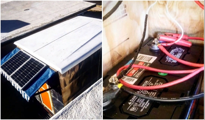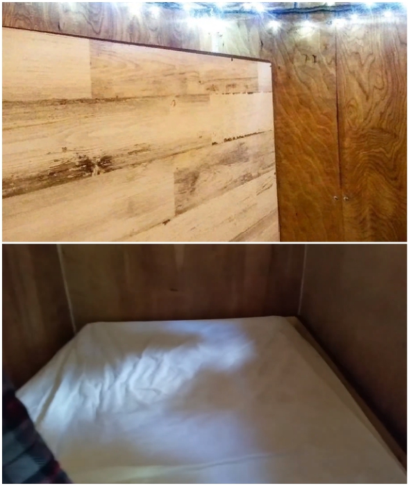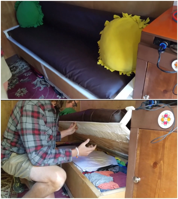 Сразу у входа Тайлер сделал тумбочки и навесные шкафы, где хранятся нехитрые пожитки супругов, продукты питания и преобразователь с аккумуляторной батареей для солнечной панели, на приобретение которой пришлось таки изрядно потратиться. В основном же на обустройство жилого пространства много средств не понадобилось, ведь мебель (кроме матрасов) была сделана из вторсырья, которое сами находили или приносили совсем посторонние люди.
