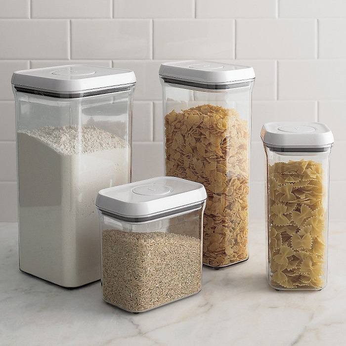 Крупы, макаронные изделия, мука, сахар обычно хранятся в заводских упаковках, занимая много места и создавая настоящий хаос в кухонных шкафчиках. Чтобы этого избежать, следует обзавестись набором высоких контейнеров для сыпучих. Лучше всего выбирать прозрачные экземпляры, в которых видно содержимое, чтобы не пришлось заморачиваться со стикерами или подписывать каждую емкость. Что касается формы, то пусть она будет квадратной. Она максимально удобна в использовании – в отличие от круглых, овальных и других форм, подобные емкости можно легко перебирать и переставлять как конструктор. Благодаря этому в шкафчиках всегда будет порядок, плюс контейнеры занимают минимум места.