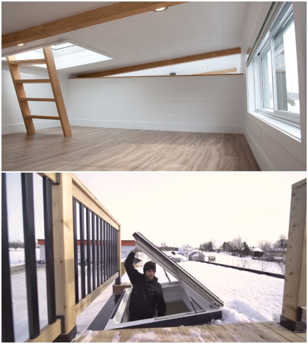 Учитывая, что дом на колесах имеет достаточную высоту, в нем удалось организовать два уровня – это позволило обустроить еще одну спальную комнату. В нее можно попасть по встроенной в кладовку лестнице. Поскольку это чердачная часть, то придется довольствоваться низким потолком, но это неудобство компенсируется мансардным окном и выходом на балкон. Несмотря на то, что открытая зона на крыше имеет весьма скромные размеры, но этого вполне достаточно, чтобы с чашечкой кофе встречать рассвет или с бокалом вина любоваться закатом.