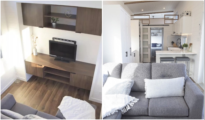 Несмотря на то, что к ширине домика добавилось всего 60 см, но переступив порог Magnolia V8, можно сразу заметить разницу. Интерьер кажется довольно просторным, особенно с белыми потолками и стенами, которые приятно контрастируют с более темными деревянными и металлическими элементами в доме. Этому поспособствовало и щедрое остекление, включающее не только изобилие окон, но и стеклянные двери – одни из которых ведут на балкон, расположенный на крыше автодома. Это еще одна особенность новой модели, которая порадует владельцев обновленной модели. На площади 37,5 кв. м специалистам компании Minimaliste удалось обустроить просторную гостиную, в которой находится диван, тумба-стол, который можно превратить в домашний офис или мультимедийную зону. Вертикальные плоскости и сам диван задействованы для обустройства систем хранения, что немаловажно для небольших жилых площадей.