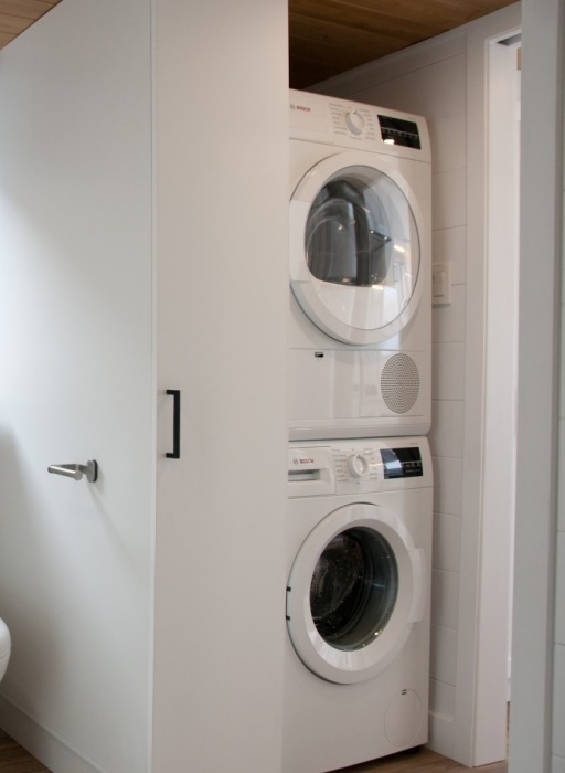 Рядом с кухней имеется и небольшая бытовка, где установлены: система электропитания, водяной фильтр и водонагреватель. Между бытовым помещением и ванной встроили стиральную машину и сушилку. Поскольку для современного человека наличие ванной комнаты и санузла внутри жилья, где бы оно не находилось и какого размера ни было, всегда является приоритетным, разработчики этой зоне уделили особое внимание. Ванная получилась довольно просторной и полностью обустроенной – душ, раковина с тумбой, большое зеркало, смывной унитаз и небольшой встроенный шкафчик. В ней, как и во всем доме, преобладают белые тона, прекрасно сочетающиеся с деревом кедра, из которого сделаны потолок, пол и несколько декоративных элементов.