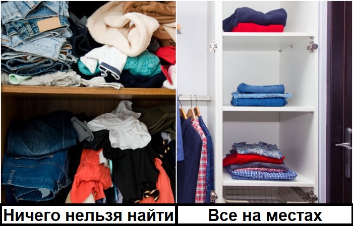 Эта ошибка упоминается в знаменитой книге Мари Кондо «Магическая уборка». Автор утверждает, что вещи, расположенные вешалках, занимают намного больше места, чем те, которые лежат на полках шкафа или в ящиках комода. Однако мы упорно продолжаем вешать на открытую вешалку платья, рубашки, пиджаки, брюки, искренне считая, что так получится быстрее найти нужную вещь. На самом деле это не так.