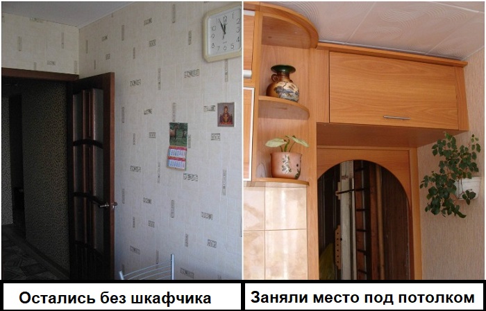 В маленькой квартире, которая к тому же забита громоздкой и массивной мебелью, очень сложно развернуться. Поэтому следует грамотно организовать систему хранения и найти применение для всех участков полезной площади. Так, например, очень часто забывают о свободном пространстве под потолком, и над дверью, в частности. Мы говорим не о классических антресолях, которые ассоциируются с советскими хрущевками, а о стильном оформлении открытого пространства.