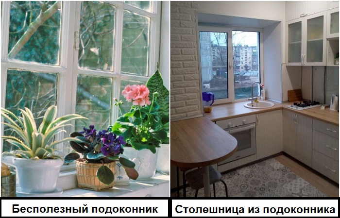 Здесь примерно такая же ситуация, как и с балконом – есть отличное место для маневров, но подключить фантазию, чтобы использовать его не по назначению, никто не хочет. Традиционно на подоконнике стоят комнатные цветы. Но если в квартире мало места, намного целесообразнее будет превратить его в рабочий стол или в продолжение кухонного гарнитура. Также он может выступить своеобразной барной стойки, если в квартире живет один-два человека, или зоной для релакса, положив мягкий матрас и несколько подушек. А пространство под подоконником послужит отличной системой хранения: обустройте там ящик или просто поставьте несколько корзин/коробок для вещей.