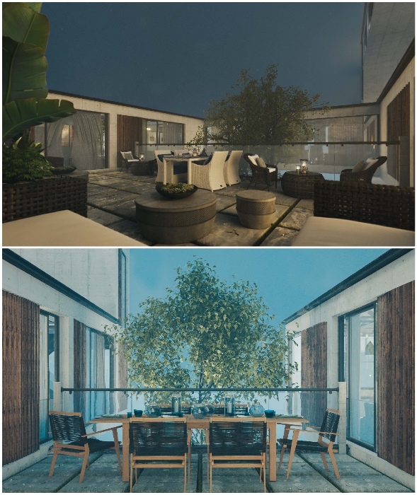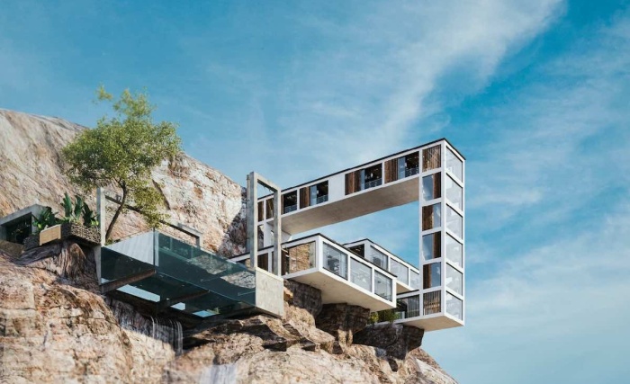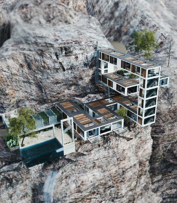 Несколько внутренних двориков станут лучшим местом для отдыха на свежем воздухе (концепт Mountain House). Одной из самых драматических конфигураций модульной системы является вертикальный замкнутый объем, выходящий далеко за пределы крутого утеса, свисая над глубоким ущельем и водной гладью. Благодаря тому, что стены и частично потолки модулей заменены стеклянными панелями, из каждой комнаты открываются умопомрачительные виды, причем в прямом смысле этого слова.